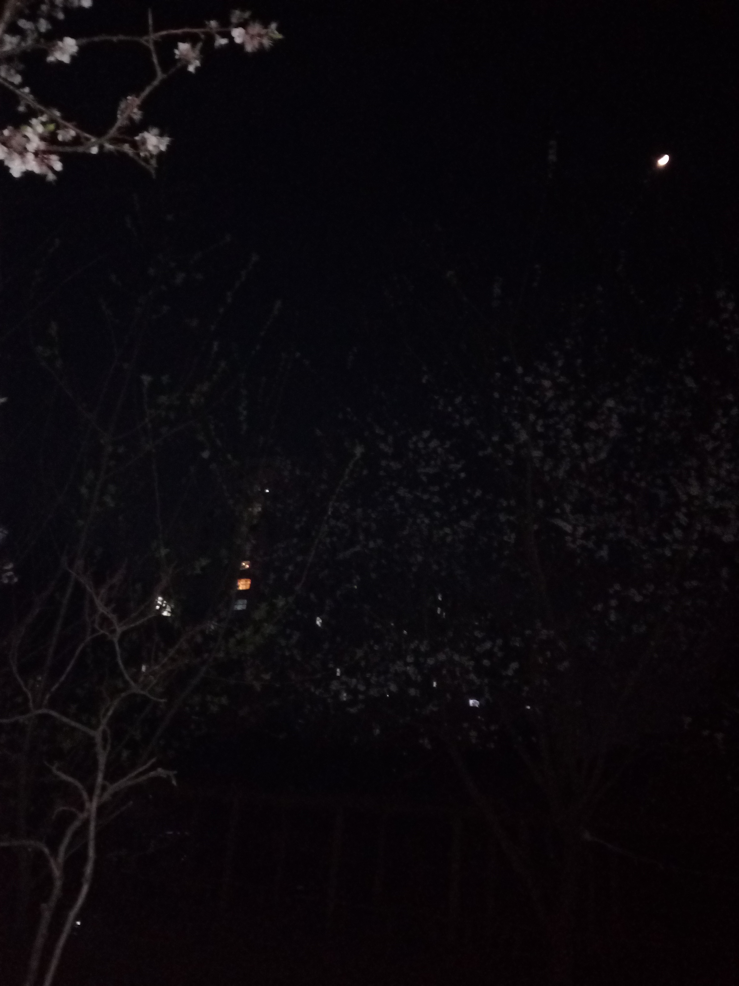 注:散步于楼前花园小径,灯光恰照眼前头上花满几树,想起白天窗外鸟鸣悦人,正怡然悦赏,忽更见花枝间一轮明月,顿诗兴油然而生,得此诗。